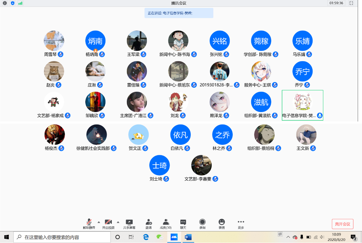 为更好的开展学生会的各项工作,满足学院改革发展的需要,永利集团304am登录团委学生会本着自我教育、自我管理、自我服务的原则,于8月20日召开2020-2021学年部门改革讨论与工作安排线上会议,讨论了新学年各部门工作规划与发展构想并提出了创新性意见与建议,力争在新学年做到以正确的方向引导人,以健全的制度塑造人,以丰富的活动锻炼人,以优质的工作服务人。参会人员包括永利集团304am登录团委书记樊晔、团委副书记刘畅、学生会主席杨炳南、服务中心主任贺文正、学生会副主席广浩江、赵炎,团委学生会各部部长干部。