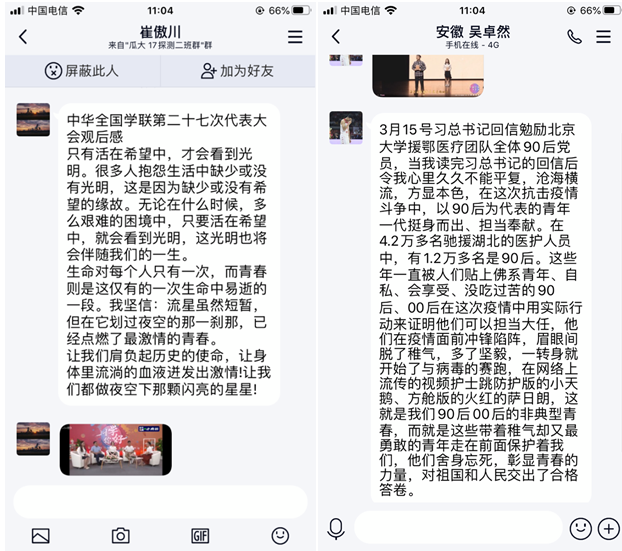 各团支书及时下发观看通知,认真做好观看结束的交流工作,并及时汇总总结。同学们充分利用各种网络平台如哔哩哔哩、学习强国、腾讯会议、QQ、微信等,采取个人分散观看或集体共享观看的方式,参与大会观看。很多同学观后颇有感触,积极参与交流,纷纷发表自己的想法。此次大会观看取得了较好学习效果。
