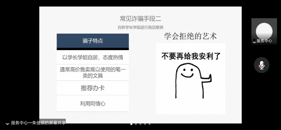 听过很多道理,却依然躲不过电信诈骗,走过最长的路,是诈骗分子的套路。新型的网络消费方式为广大群众带来了实惠和便利,同时也给不法分子利用现代通讯技术和网络结算方式实施诈骗等犯罪活动提供了可乘之机。服务中心朱佳琪同学结合身边同学实例,风趣且深入地分析了校园中常见的电信诈骗手段,提出了应对办法,为保护同学权益、防范电信诈骗提供了有力支撑。