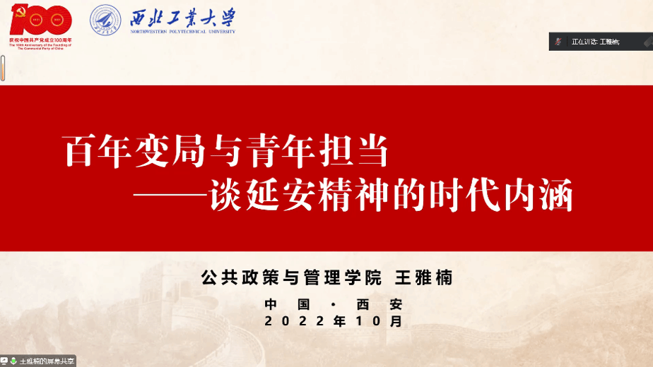 随后,王雅楠讲到西工大人艰苦奋斗、自力更生的精神脉络。扎根西部、献身国防,聚焦国家战略需求和世界科技前沿,重点参与大飞机、载人航天与探月等10多个国家论证及科研攻关,都是西工 大人传承接力延安精神、践行时代使命的重要体现。
