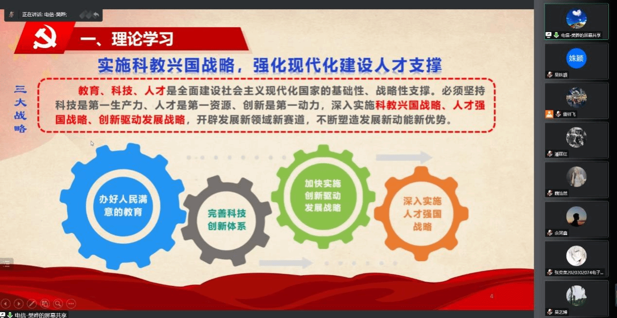 支部书记樊晔同志首先结合报告内容,分析和解读了科教兴国战略在新时代的科学内涵和使命任务。党的二十大报告强调科教兴国战略,并将科教兴国战略、人才强国战略、创新驱动发展战略摆在一起,将教育、科技、人才整合到一起进行系统谋划,共同服务于创新型国家建设。樊晔同志强调,作为新时代的青年,我们要不畏艰难、守正创新、勇担责任,为建设社会主义现代化强国而奋斗。