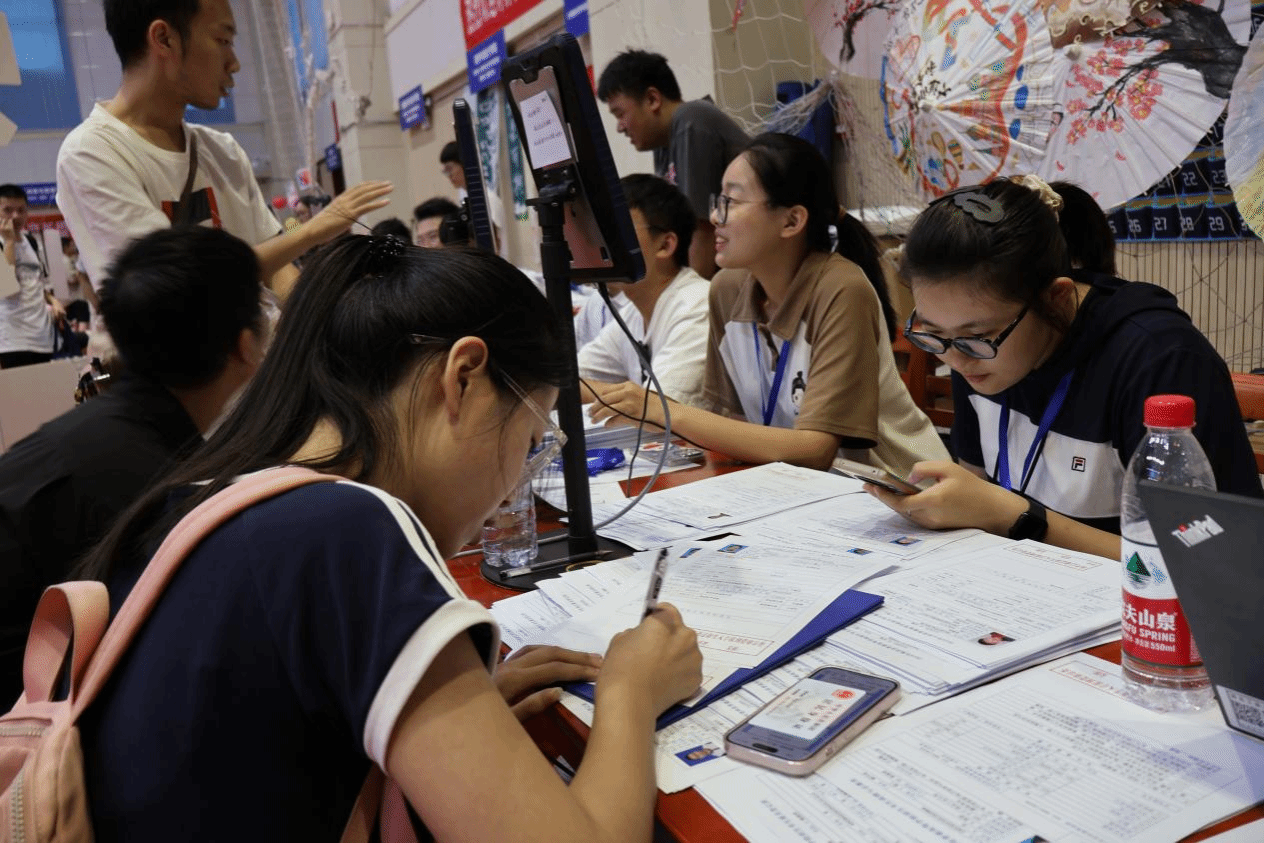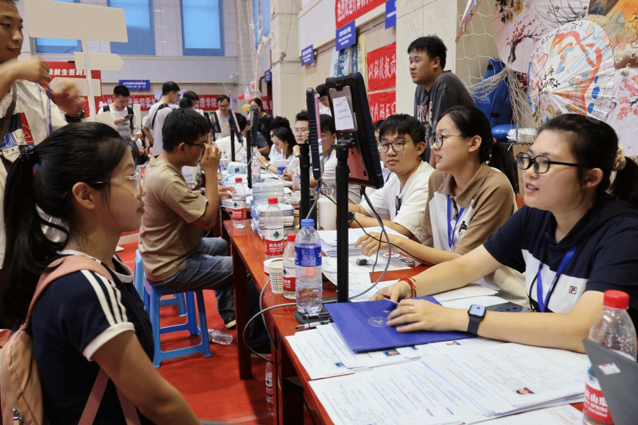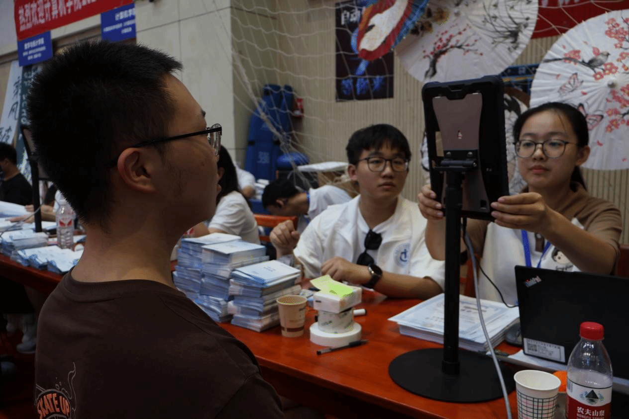 负责内场迎新的学长学姐们规范有序地核验新同学们的资料,帮助新生们在迎新系统里完成报到注册,核对好信息后,向大家分发校园一卡通。