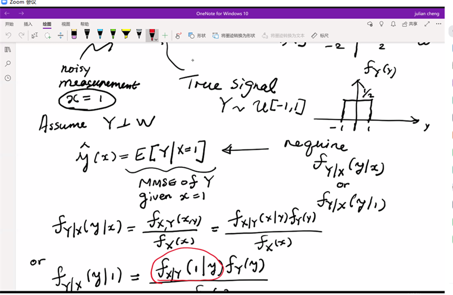 Julian Cheng教授的Signals, Systems and Inference课程采用Zoom进行线上授课,该课程共计16学时(8月3号到8月7号)。在授课过程中,他将数学的相关知识与信号与系统的基础理论紧密结合,从基础概念出发,主要讲述了下面几部分内容:1、对最小二乘LS(Least Squares)、最大后验概率MAP(Maximum a posteriori Probability)、最大似然ML(Maximum Likelihood)、均方误差MSE(Mean Squared Error)、最小均方误差MMSE(Minimum Mean Square Error)等多个估计算法数学来源进行了详细且全面的推导;2、分析了最大后验概率MAP和最小均方误差MMSE这两种估计算法之间的区别与联系;3、根据线性最小均方误差准则LMMSE,从接收到的信号中提取所需信号,并且讨论了滤波的相关问题;4、推导出了具有有限持续时间脉冲响应的可实现离散维纳滤波器。在整个的讲授过程中,Julian Cheng教授鼓励学生积极提问,并在课下与同学们分享了自己的学习资料和笔记。授课结束后, Cheng教授以英文大作业的形式对学生成绩进行考核。