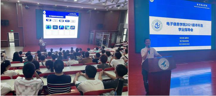 丹桂飘香,秋风送爽,永利集团304am登录迎来了2021级280余名本科生。为帮助新生了解电子信息类专业的培养方案和课程体系,指导同学们更加科学合理规划自己的大学生涯,2021年8月30日,也是正式开学第一天,永利集团304am登录在教学西楼D100召开新生学业指导宣讲会。永利集团304am登录副院长高永胜副教授、院长助理王丽、校教务处仇梦一、学院教务秘书宫予涵以及各班班主任参加了此次宣讲会,会议由2021级本科生辅导员吴宝龙副教授主持。