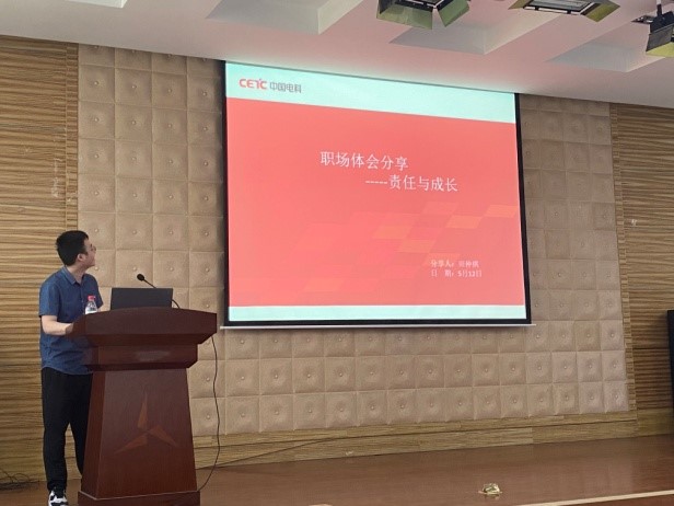 我院17级优秀硕士毕业生、中国电科新一代移动通信创新中心的员工田仲祺,分享了自己的职场体会,用切身经历向同学阐述了职场生活与校园生活的异同,给予学弟学妹们宝贵的经验积累和发展建议。