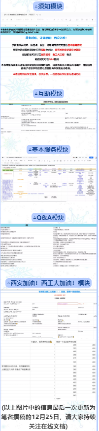 从空白文档到填满互助信息,各个模块的字里行间都蕴含着爱与希望。在互助模块,大家可以将自己的富裕物品以各种形式处理给其他需要的同学,满足其他人的需求;在基本服务情况模块,广大师生可以了解校园的最新动态,各个教学生活场所的最新防疫政策,以及各个校内营业点的运营情况;在Q&A模块,我们的志愿者将会根据最准确的信息来回答大家提出的问题;在西安加油!西工大加油模块,大家可以将最诚挚的祝福以文字的形式写下,来祝福西安,鼓励考研人……
