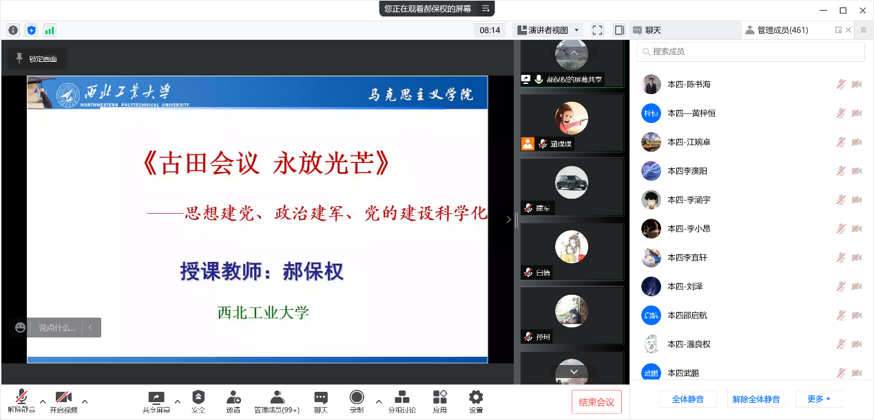 为深入学习贯彻习近平总书记在党史学习教育动员大会上重要讲话精神,根据中共中央办公厅《关于推动党史学习教育常态化长效化的意见》文件精神,3月25日下午,永利集团304am登录邀请陕西省政党治理与意识形态安全中心主任、学校马克思主义学院教授郝保权老师做题为“古田会议永放光芒”的党史学习教育专题线上培训活动。学院党委书记、教师党支部、学生党支部、班主任、辅导员及办公室人员参加了此次培训活动,活动由学院党委副书记彭亮主持。