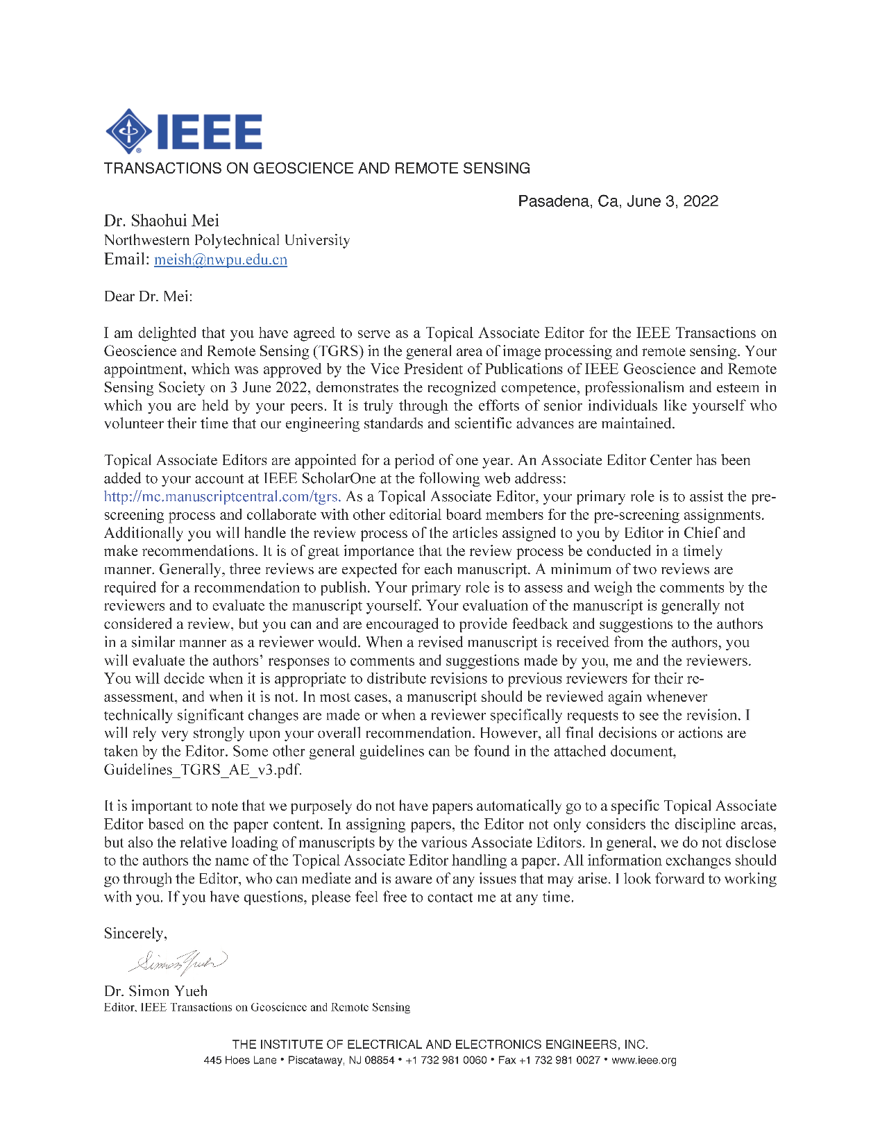 近日,永利集团304am登录梅少辉副教授被美国电气和电子工程师协会(Institute of Electrical and Electronics Engineers,IEEE)聘任为旗下学术期刊IEEE Transactions on Geoscience and Remote Sensing (TGRS) 领域副主编(Topical Associate Editor)。