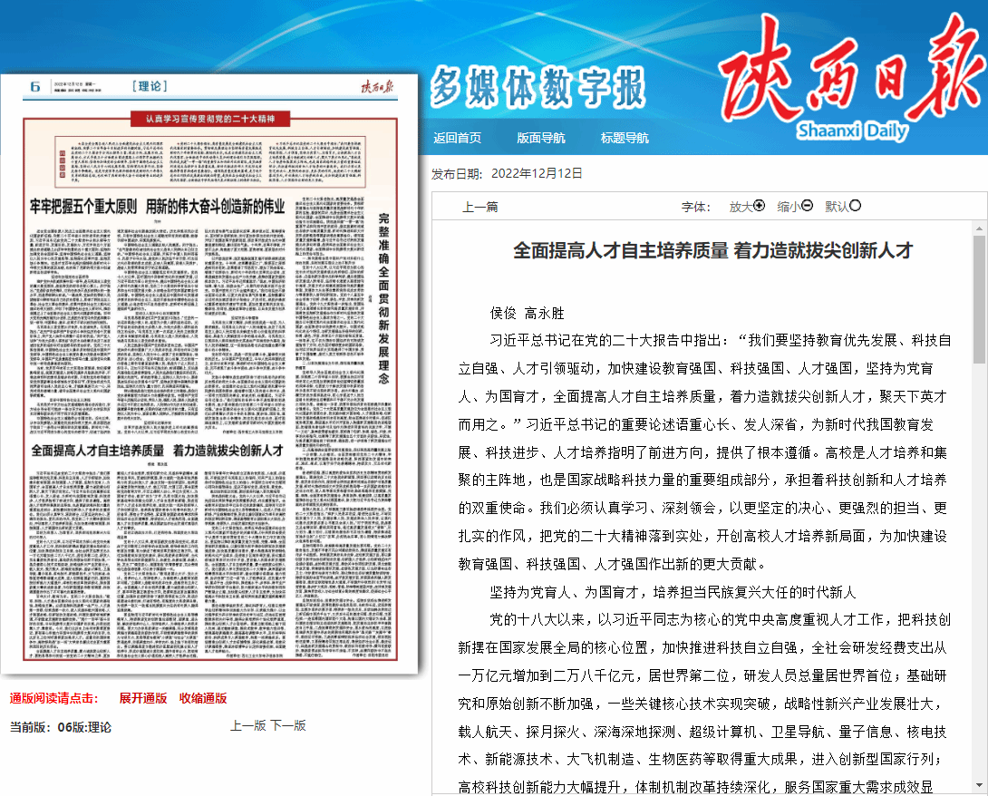12月12日,《陕西日报》理论版“认真学习宣传贯彻党的二十大精神”专栏,刊登永利集团304am登录侯俊、高永胜署名的理论文章:“全面提高人才自主培养质量 着力造就拔尖创新人才”。