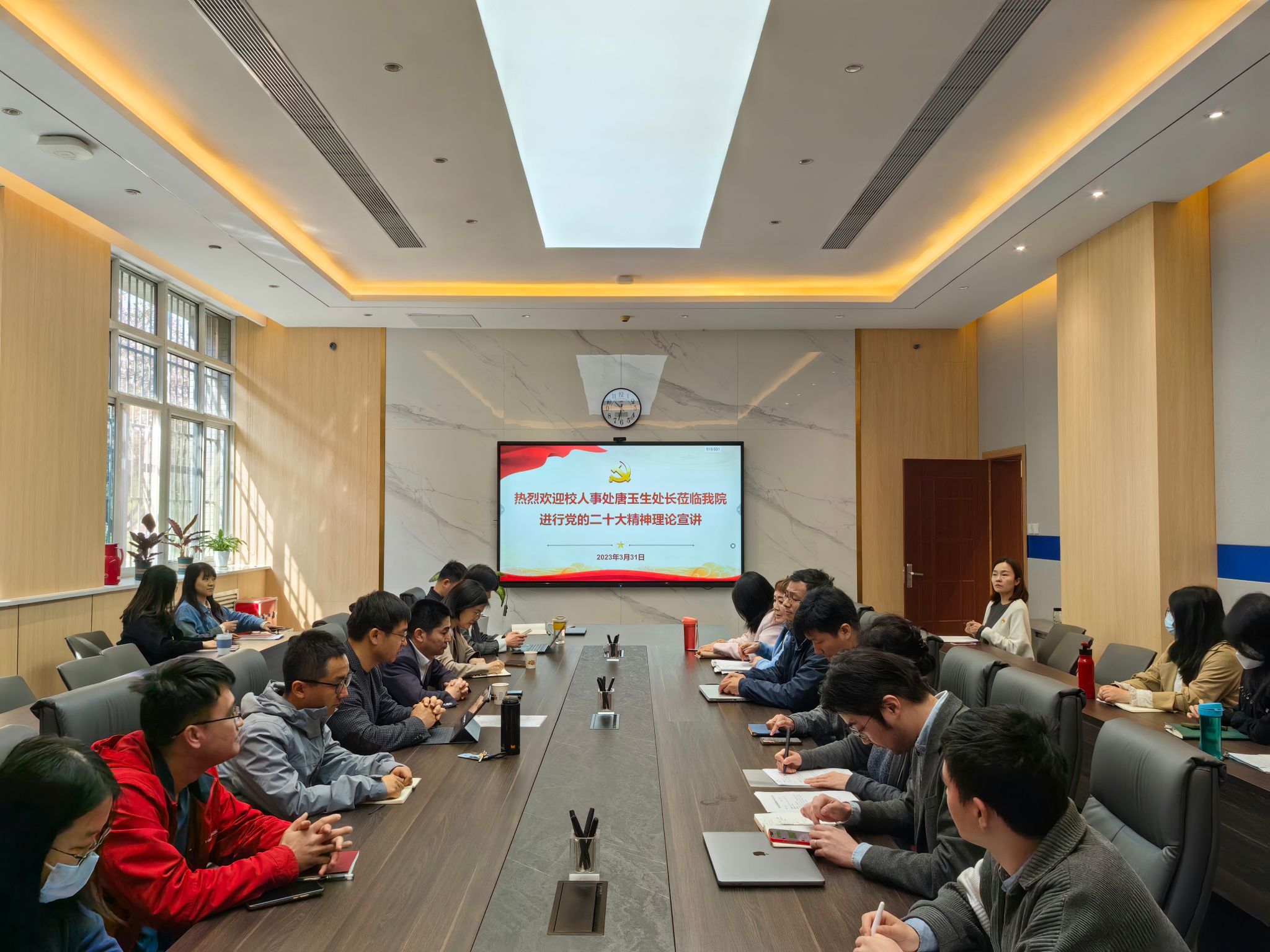 深入学习贯彻习近平新时代中国特色社会主义思想和党的二十大精神,3月31日上午,永利集团304am登录邀请学校党的二十大精神宣讲团成员、人事处处长唐玉生来到学院,以“深入学习领会党的二十大精神,扎实推进学校人才工作高质量发展”为题,进行党的二十大精神学习宣讲。本次宣讲活动在学院楼119会议室举行,由学院党委书记侯俊主持。学院副书记高敏、副院长姚如贵、副院长高永胜以及党委理论学习中心组成员、各教师支部委员、学院办公室人员参加了宣讲会。
