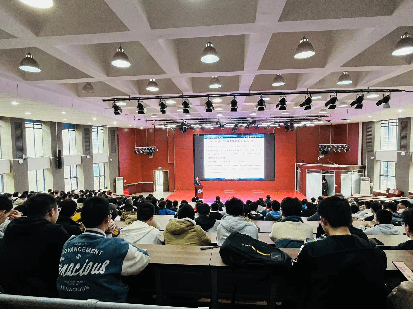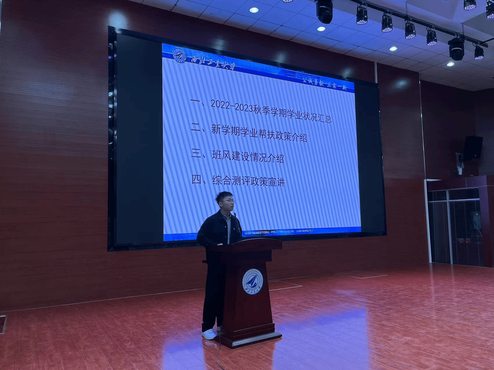 本次大班会主要分为四个部分,首先由翟伟乐分析了2022-2023秋季学期学业状况汇总,从测评人数、课程未通过人数及比例等几个方面剖析了上学期的学业状况,指出由于疫情网课、延迟考试和同学们还未适应大学的学习状态等因素,有少数同学的成绩不尽如人意,存在不及格现象,大部分同学也还需继续努力,以饱满的姿态投入到新学期的学习中去。