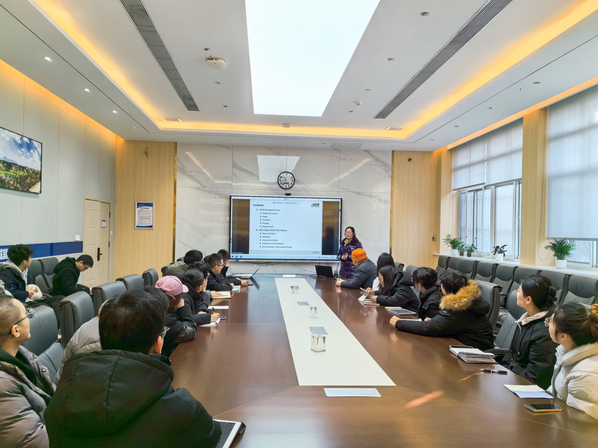 王佳副教授首先介绍了张慧博士的个人简历,随后张慧博士做了题为《高压CMOS像素传感器》的报告,首先介绍了CMOS集成电路设计流程,对设计环境、设计工具、生产制造、封装测试等进行了简要说明。以此作为引题,报告进入第二部分“高压CMOS像素传感器设计”。从CMOS工艺的刨面图对比介绍了高压CMOS像素传感器与普通CMOS传感器的区别,突出了其优点。在此基础上介绍了该类电路的主要应用领域。从电子元器件级到系统级设计进行了翔实生动的讲解。最后,张慧博士结合设计的多个芯片实例,对电路设计、版图设计、测试结果分析的整个芯片流程做了讲解。