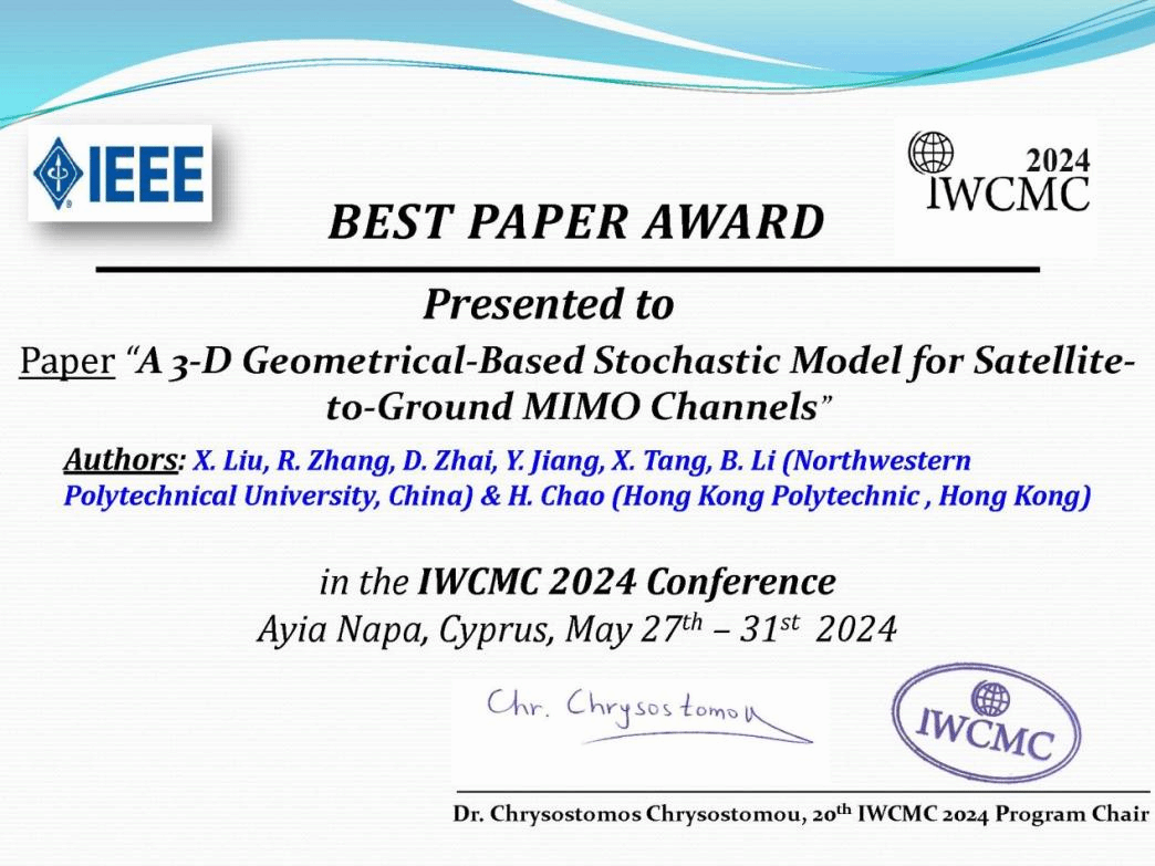 近日,第20届IEEE国际无线通信与移动计算大会(The 20th IEEE International Wireless Communications & Mobile Computing Conference,以下简称IWCMC´2024)落下帷幕,永利集团304am登录张若南教授课题组的论文《A 3-D Geometrical-Based Stochastic Model for Satellite-to-Ground MIMO Channels》凭借卓越的创新力荣获IWCMC´2024最佳论文奖。论文的第一作者为我院2021级硕士研究生刘新华。