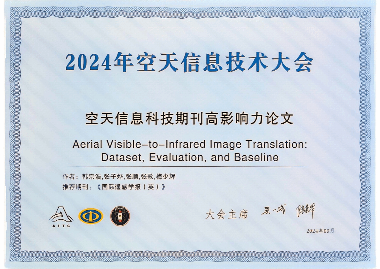 在本次大会的“空天信息领域科技期刊突出贡献人物”评选环节中,永利集团304am登录梅少辉教授作为通信作者的论文《Aerial Visible-to-Infrared Image Translation: Dataset, Evaluation, and Baseline》荣获“空天信息科技期刊高影响力论文”,全国共14篇论文入选。
