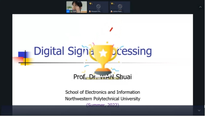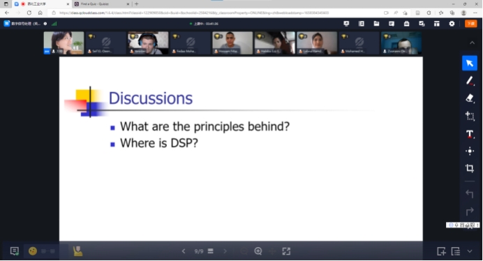 为扎实推进学校“双一流”建设,促进学校国际化发展,提升学校的全球影响力、竞争力和塑造力,永利集团304am登录积极参与永利集团304am登录“学在工大——全球暑期开放课堂”项目。在国际教育学院的指导下,经过前期精心筹备,学院根据学科特点和专业特色,围绕前沿研究专题,于7月9日-7月21日面向海外学生开设了全球暑期开放课堂——《Digital Signal Processing》(数字信号处理),课程由万帅教授主讲,张易凡副教授担任助教。本课程主要通过全球融合式教学平台(OMO)进行线上授课,辅以Quizizz平台进行互动测试,受到海外知名高校学生欢迎,吸引了来自俄罗斯、埃及等多个国家的学生在线参与学习。