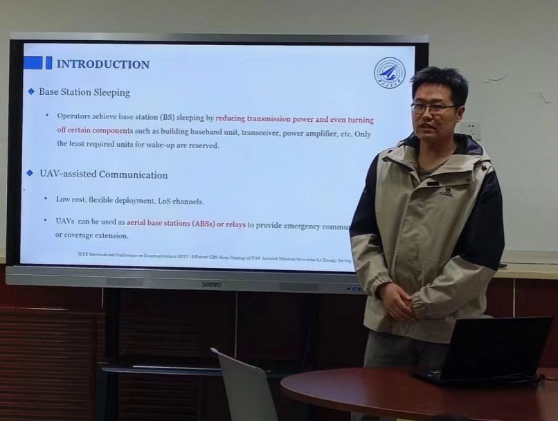 李欢分享了自己的参会经历并给出了详细的参加国际会议的建议。在报告中,李欢重点介绍了其团队提出的无人机辅助绿色通信策略以及其中的空地设备调度问题。为了解决该问题,其团队提出了一种联合优化空地设备部署和资源分配的低复杂度算法,进一步降低了网络能耗。